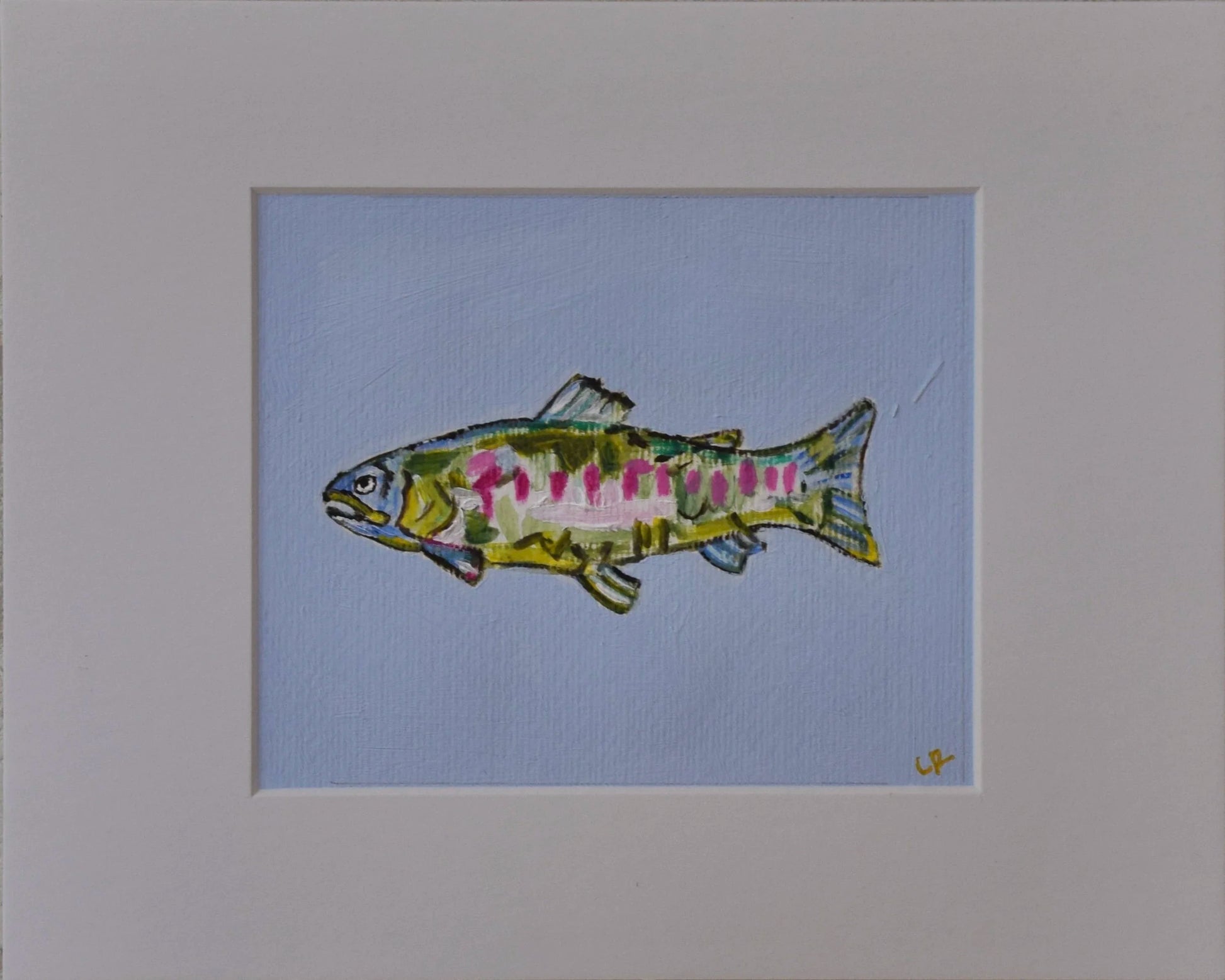 This is an original acrylic painting on heavy weight paper. It is displayed in a bright white mat, mounted on a white backing board and comes in a clear protective plastic sleeve. The actual painting is 5” x 6” and the size of the entire piece is 8” × 10". Painting can be displayed as is or placed in a frame.