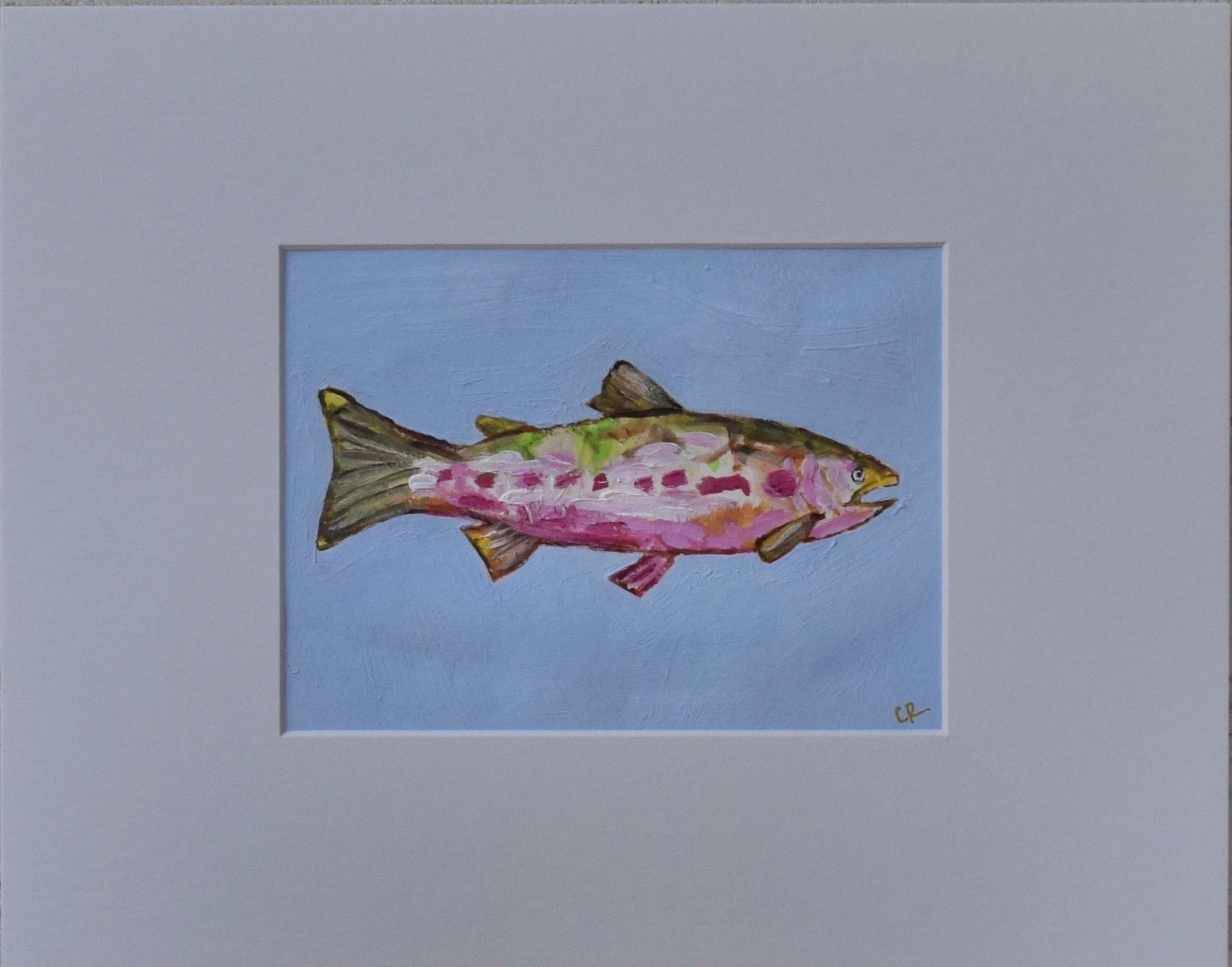 This is an original acrylic painting on heavy weight paper. It is displayed in a bright white mat, mounted on a white backing board and comes in a clear protective plastic sleeve. The actual painting is 5” x 7” and the size of the entire piece is 11” × 14". Painting can be displayed as is or placed in a frame.