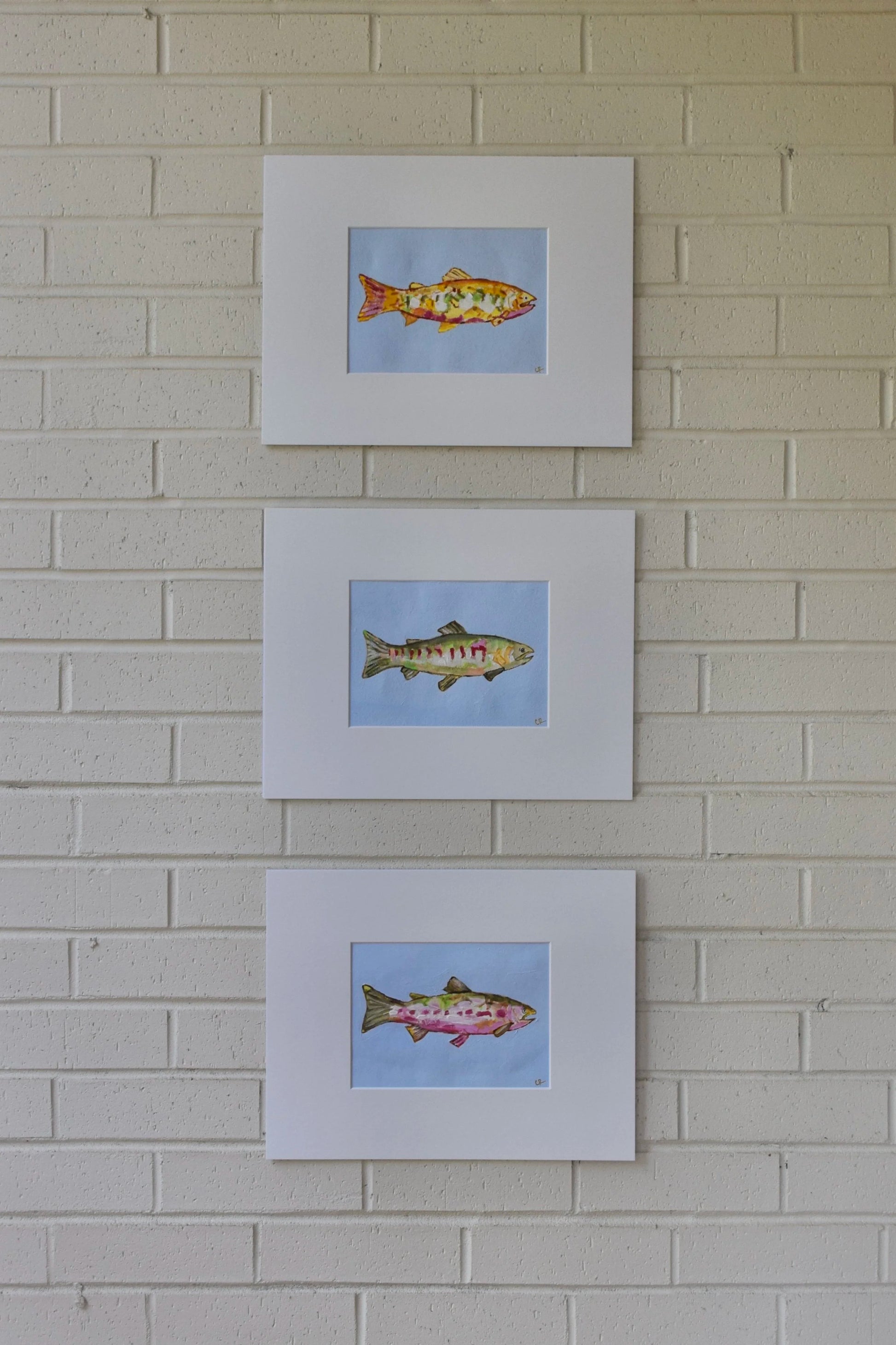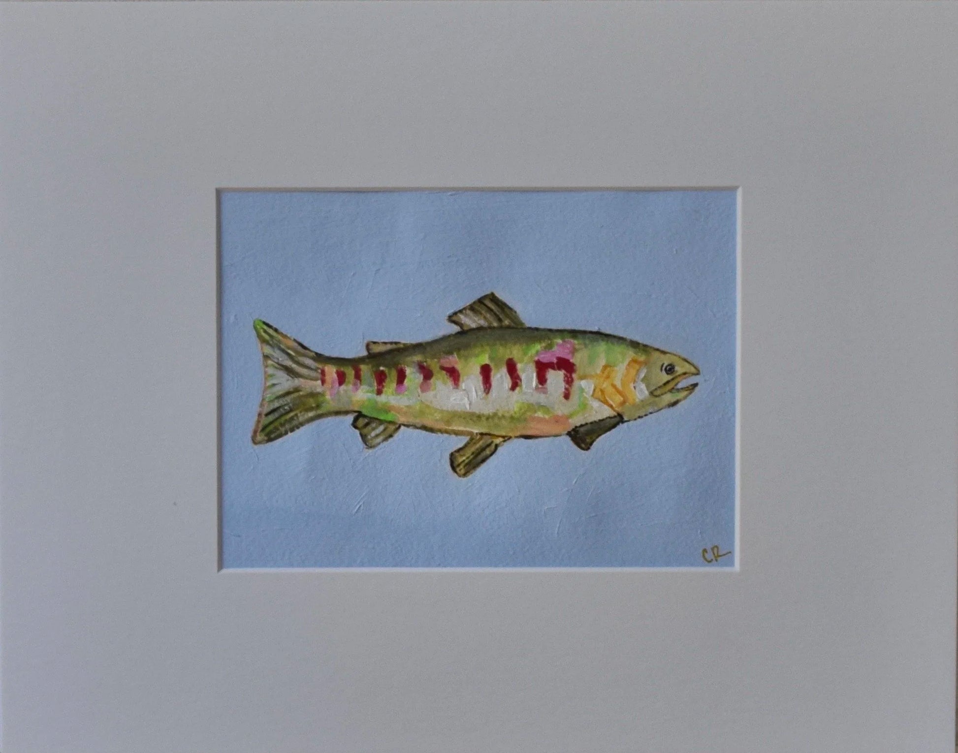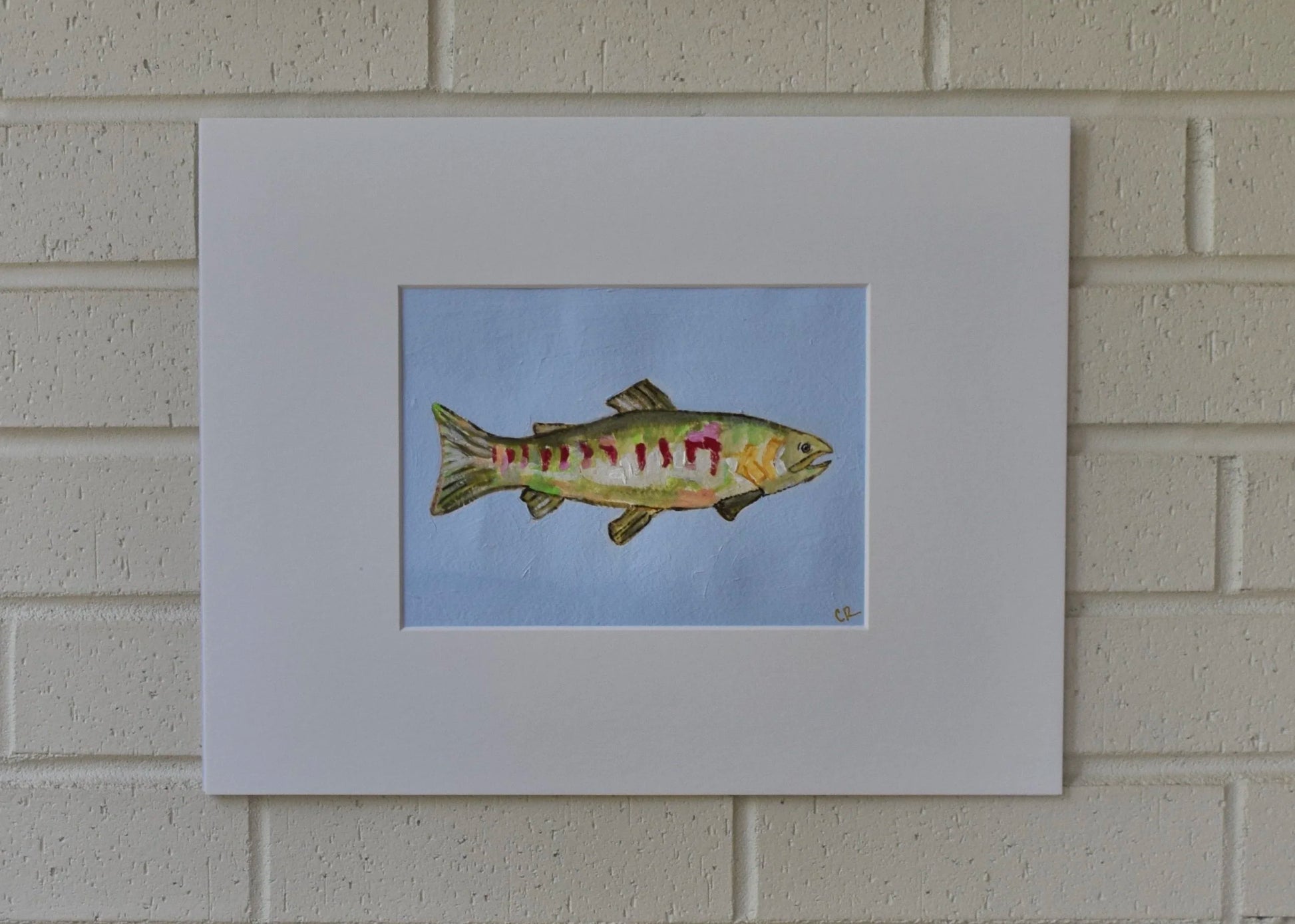 This is an original acrylic painting on heavy weight paper. It is displayed in a bright white mat, mounted on a white backing board and comes in a clear protective plastic sleeve. The actual painting is 5” x 7” and the size of the entire piece is 11” × 14". Painting can be displayed as is or placed in a frame.