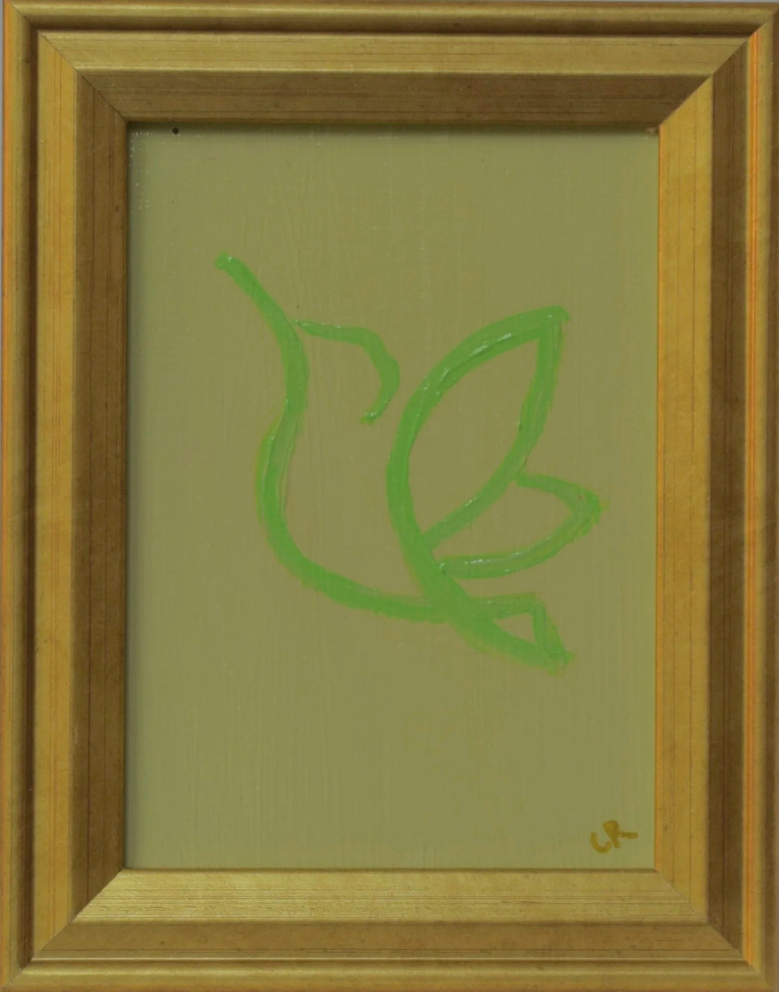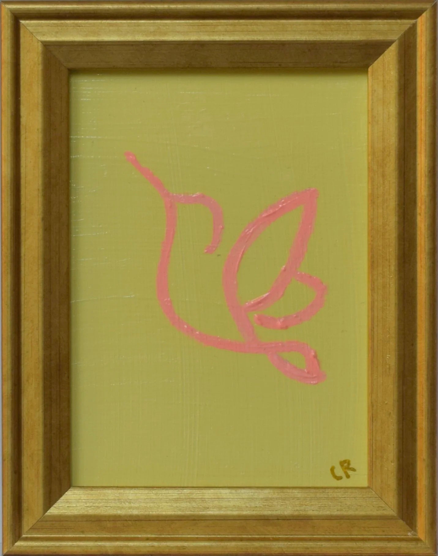 This is an original acrylic painting on canvas in a gold colored frame. The displayed artwork measures 3.5” x 2.5” and the entire piece measures 4.75” x 3.75”. A fold out easel is attached to frame backing.